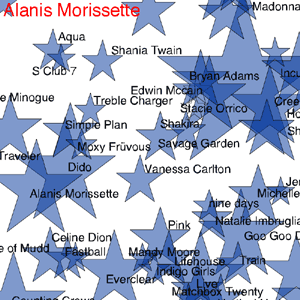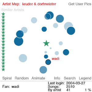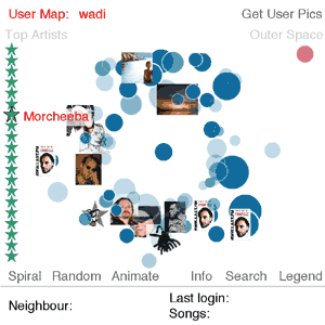 added. The more listeners that contribute, the more accurate the map becomes. musiCompass is like an atlas of music, providing a visionary interface for people to explore and exchange individual music taste and to find a community who share their passion in music. People tend to tie their identity to the music they listen to, and musiCompass helps to bring these people together. Expirence the new world of music with musiCompass at <www.audioscrobbler.com> and <www.last.fm> |
