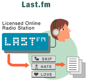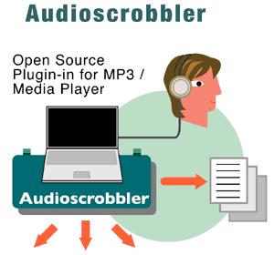 audioscrobbler: After a user has installed an open source audioscrobbler plug-in, their media player (such as Winamp, iTunes etc) logs what songs they listen to on their PC. This data becomes part of their music profile. |