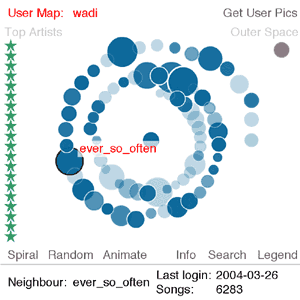 The neighbourhood: The neighbourhood is a visualisation of the connections between a listener’s music taste and the tastes of similar listeners. The distance between the individual listener and his related listeners is a matter of similarity of the music taste profile. The user’s top ten artists are displayed. Furthermore, the activity of the listener (transparency) and the amount of listened songs (size) is shown. |
